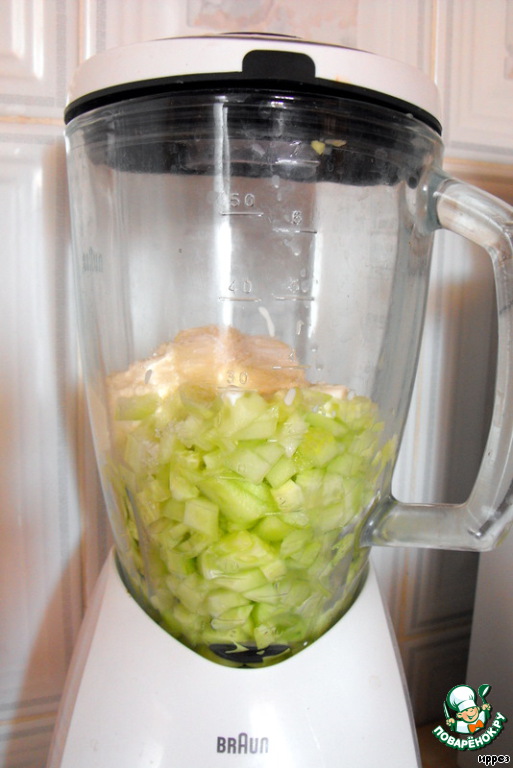 Огурцы очистить от кожицы (если семена крупные, их тоже удалить), нарезать кубиками. Чеснок измельчить.