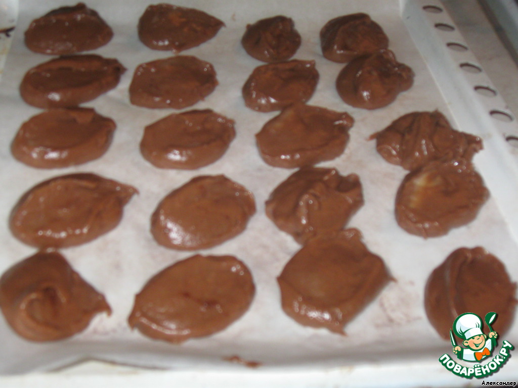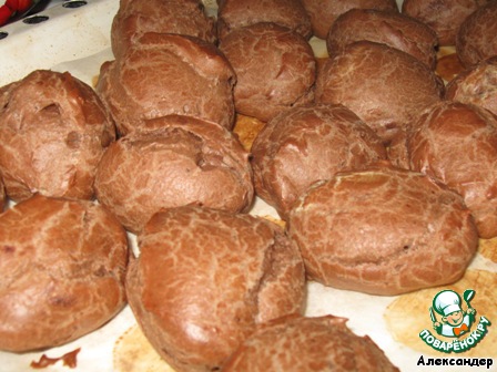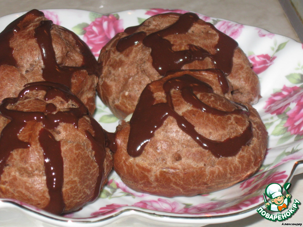 Стакан воды и 100 г масла довести до кипения. Бросить щепотку соли (можно и без нее) и стакан муки. Выключить огонь и интенсивно вымесить тесто. Немного охладить. По одному ввести 4 яйца и какао. Тесто должно получиться однородным и шелковистым. На противень выложить ложкой пирожные и отправить в духовку минут на 40-45.