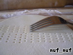 Слоёное тесто разморозить и раскатать толщиной 0.3-0.5 см. С помощью блюдца (15 см в диаметре) вырезать круг. Перевернуть заготовку и наколоть тесто часто вилкой.
