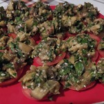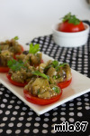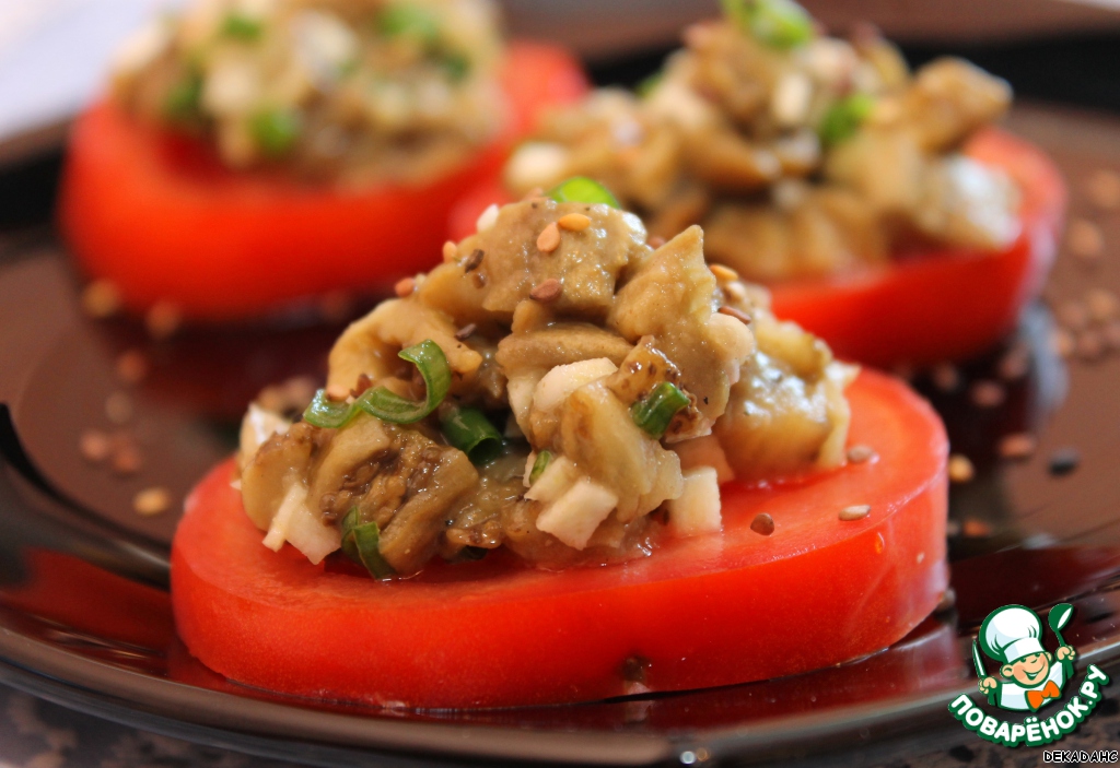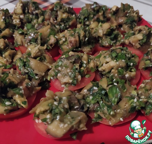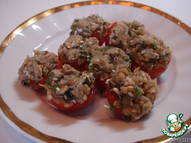 Подавать на кружках помидора, посыпав кунжутом.