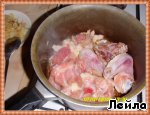 В кастрюле, в которой жарился лук, обжариваем куски курицы до золотистого цвета.