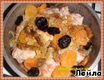 Возвращаем в кастрюлю с курицей лук и кладем сухофрукты.