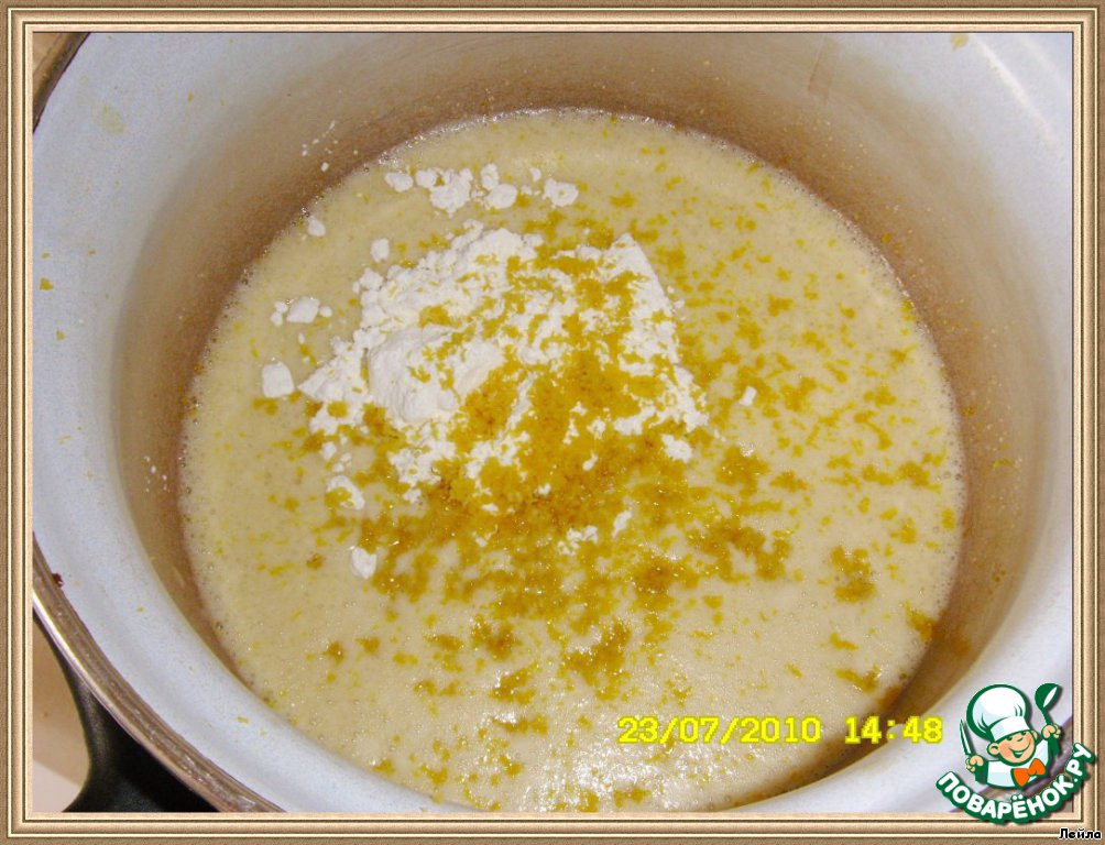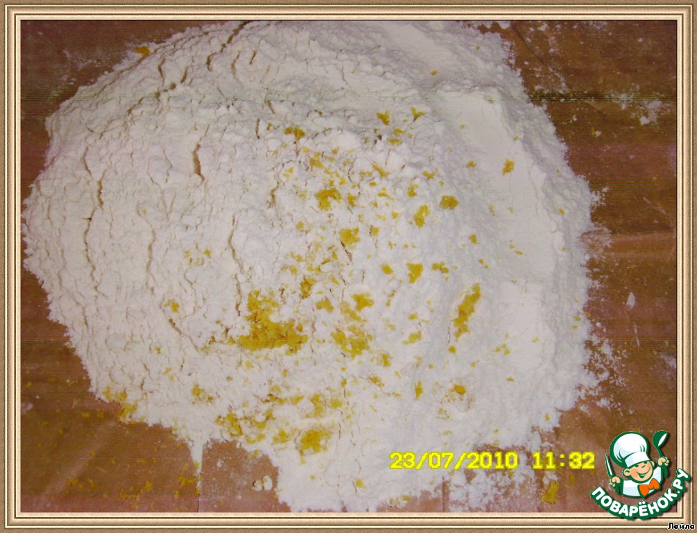 [b]Тесто.[/b] Просеять муку, добавить разрыхлитель, тертую лимонную цедру,