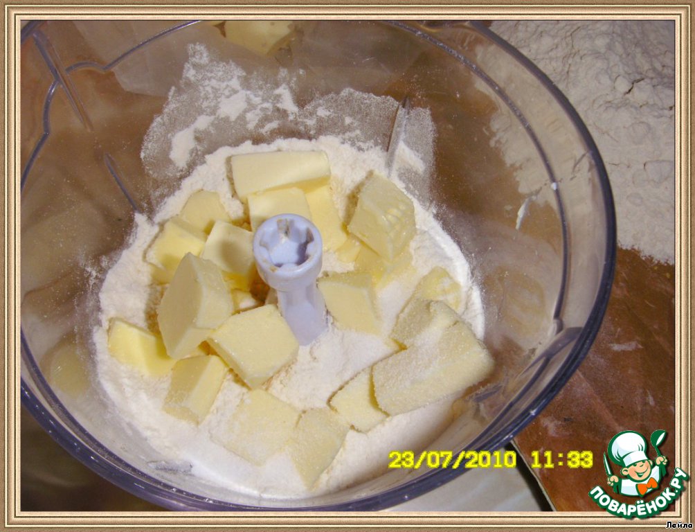 В миску комбайна положить все продукты для теста и при помоши насадки "Пульс" приготовить тесто.