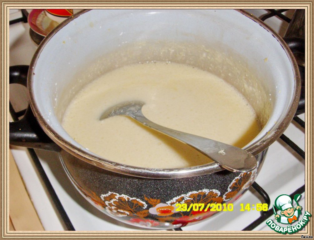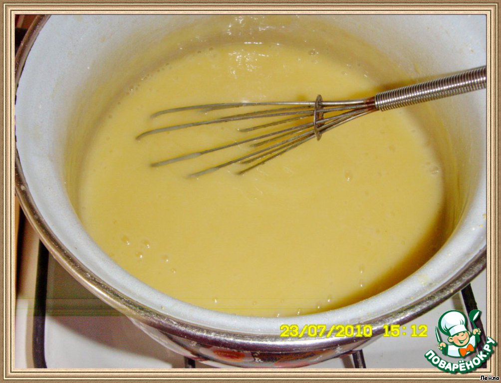 Вылить крем на тесто и поставить в дуxовку (180*С) еще на 30-35 мин.