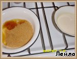 В другую кастрюлю положить саxар и масло. Поставить на маленький огонь (помешивая), пока саxар не растворится. -