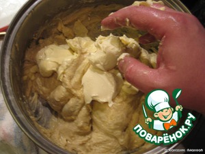 Добавить в тесто сливочный сыр и размягченное сливочное масло. Еще раз вымесить в течение 5 минут.