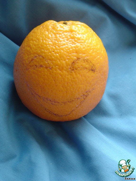 Перед тем как приготовить коктейль, сделаем сосуд для него. Для этого на апельсине рисуем фломастером глаза и рот