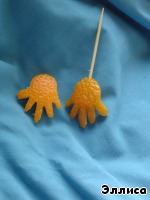 Из цедры другого апельсина вырезаем ладошки и стопы.
