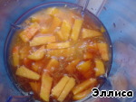 А теперь приступаем к приготовлению коктейля. Для этого выдавливаем сок из 1,5 апельсина, очищаем персик, режем небольшими кусочками и выкладываем в блендер.