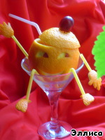 Коктейль готов, и мы собираем в единую композицию все подготовленные части так, как Вы видите на фото. Из красной виноградинки делаем бубон на "берет", а также кусочки винограда вставляем в уголки глаз. Руки и ноги: одна рука, которая поднята вверх, - это просто изогнутая трубочка под апельсином, в ладошку вставлена зубочистка, а зубочистка - в трубочку. Рука, которая смотрит вниз: к ладошке крепится зубочистка, отрезается кусочек трубочки, одевается на зубочистку, а свободный конец зубочистки вкалывается в верхнюю часть апельсинового сосуда.