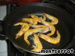 В широкой плоской кастрюле слегка обжариваем на мaсле креветки, отставлаем