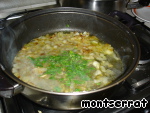 добавляем вино, зелень петрушки, горошек, провариваем 5 мин. -