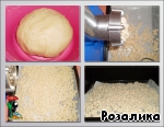 Готовое отдохнувшее тесто пропускаем через мясорубку на противень, предварительно застеленный пекарской бумагой, которую смазали маслом. -