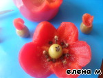 В отверстие оливки вставляем кусочки болгарского перца, которые у нас остались при изготовлении цветка. -