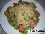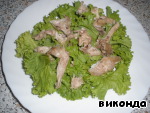 разберем по волокнам курицу, разложим ее поверх салата