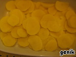 Картошечку чистим и режем ломтиками 0.5 см. Выкладываем в форму.