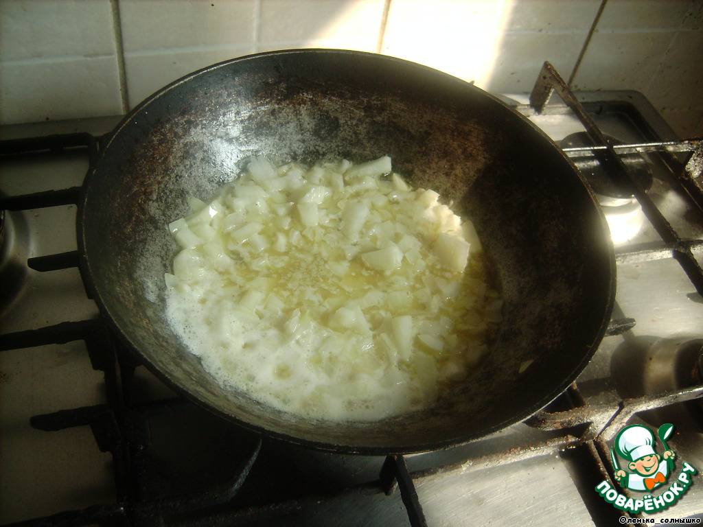 в глубокую сковороду кладем масло и мелко нарезанный лук, немного обжариваем