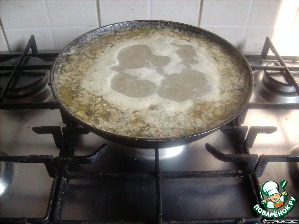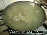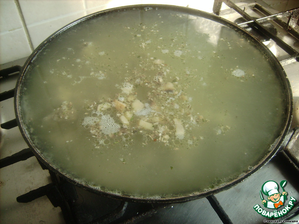 кладем муку, перемешиваем и заливаем бульоном