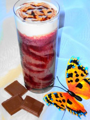 Влить молочно-шоколадный коктейль. Размешать ложкой так, чтобы получились разводы. Сверху выложить взбитые сливки и полить растопленным шоколадом.