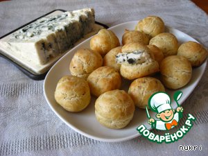 Вбивайте яйца по одному, вымешивая миксером до гладкости. Добавьте раскрошенный сыр, перемешайте. Сформируйте профитроли и выложите на покрытый пергаментом противень. Смажьте их яйцом.