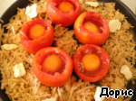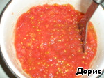 Из мякоти помидоров пока приготовим соус. Старательные девочки могут воспользоваться ситом и перетереть томатную массу. Я просто потолкла толкушкой для пюре.