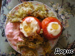 Отличная идейка для завтрака. Быстро и вкусно. Нежные помидоры с классическими, как для завтрака, яйцами. Похрустывающая картошечка и острый соус.