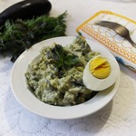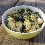 Очень мелко порезать одну небольшую луковицу и обжарить на растительном масле. Соединить все ингредиенты, посолить, поперчить по вкусу и заправить майонезом.