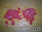 А тем временем снимаем кожицу с половины помидора и нарезаем небольшими кубиками -