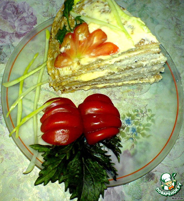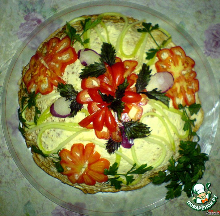 После того, как все слои собраны, ставим наше произведение в микроволновку (или духовку) на 5 (10) минут для того, чтобы подтаял сыр. И ещe немного даeм пирогу постоять, чтобы пропитались слои (как раз есть время на украшение).