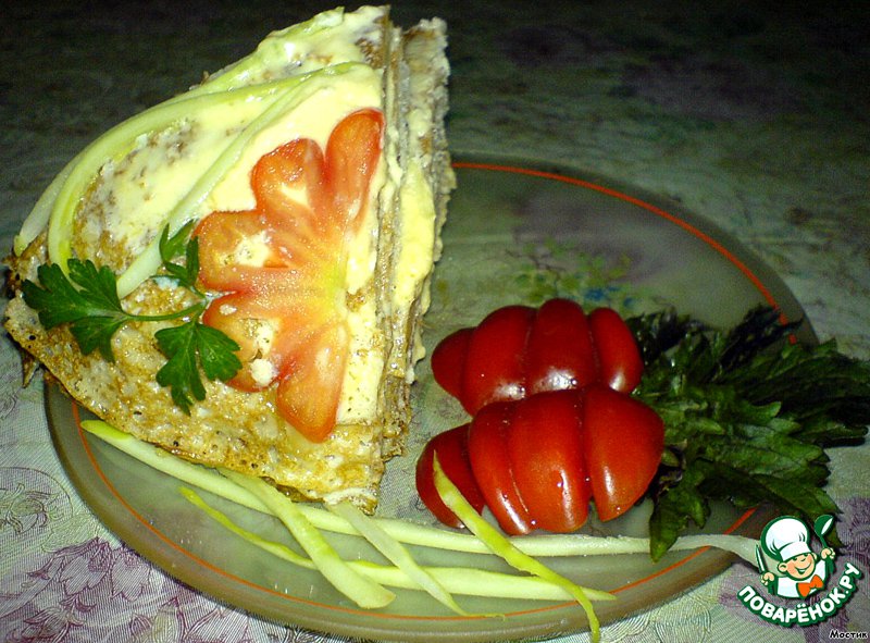 Сверху снова блин, который смазываем аджикой (можно заменить любимым соусом).