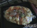 Берем рукав. Завязываем его с одной стороны, на дно засыпаем часть овощей, на них раскладываем курицу, вокруг курицы выкладываем картофель и засыпаем остатками овощей, можно посыпать зеленью. Завязываем второй край рукава. Прокалываем его в нескольких местах сверху, чтобы воздух выходил.