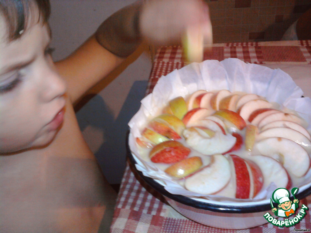 Форму застилаем пергаментной бумагой, выливаем тесто (оно должно заполнить только половину формы). Сверху выкладываем яблочные дольки и слегка притапливаем их. -