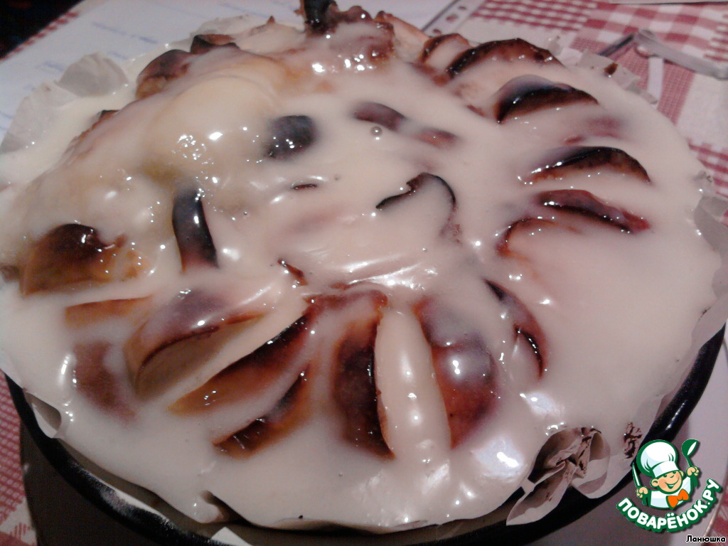 Достаем пирог из духовки (в форме) и заливаем нашей заливкой. Сверху посыпаем корицей с сахаром (я не посыпала) и ставим назад в духовку. Через 5-7 минут духовку выключаем, а пирог оставляем в ней до полного охлаждения. -