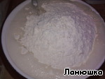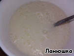 В отдельной посуде смешиваем кефир со стаканом сметаны, добавляем соду, перемешиваем и соединяем со взбитыми яйцами.