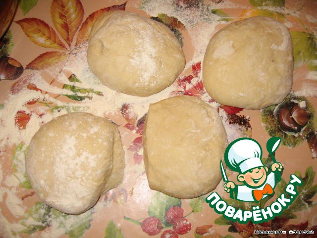 Добавить оставшуюся муку и молоко, вымесить крутое тесто (при необходимости добавлять муки). Накрыть полотенцем и оставить подниматься на 2 часа. Тесто должно увеличиться в объеме вдвое. Накрыть полотенцем и поставить в теплое место на 30 минут. Затем тесто обмять и оставить еще на 30 минут. Разделить на части для приготовления.