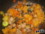 Добавляем нарезанную кубиками тыкву и грибы. Солим. Жарим до полуготовности.