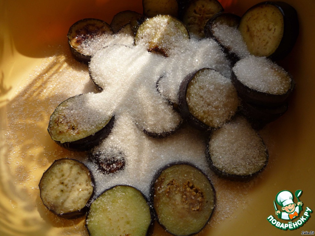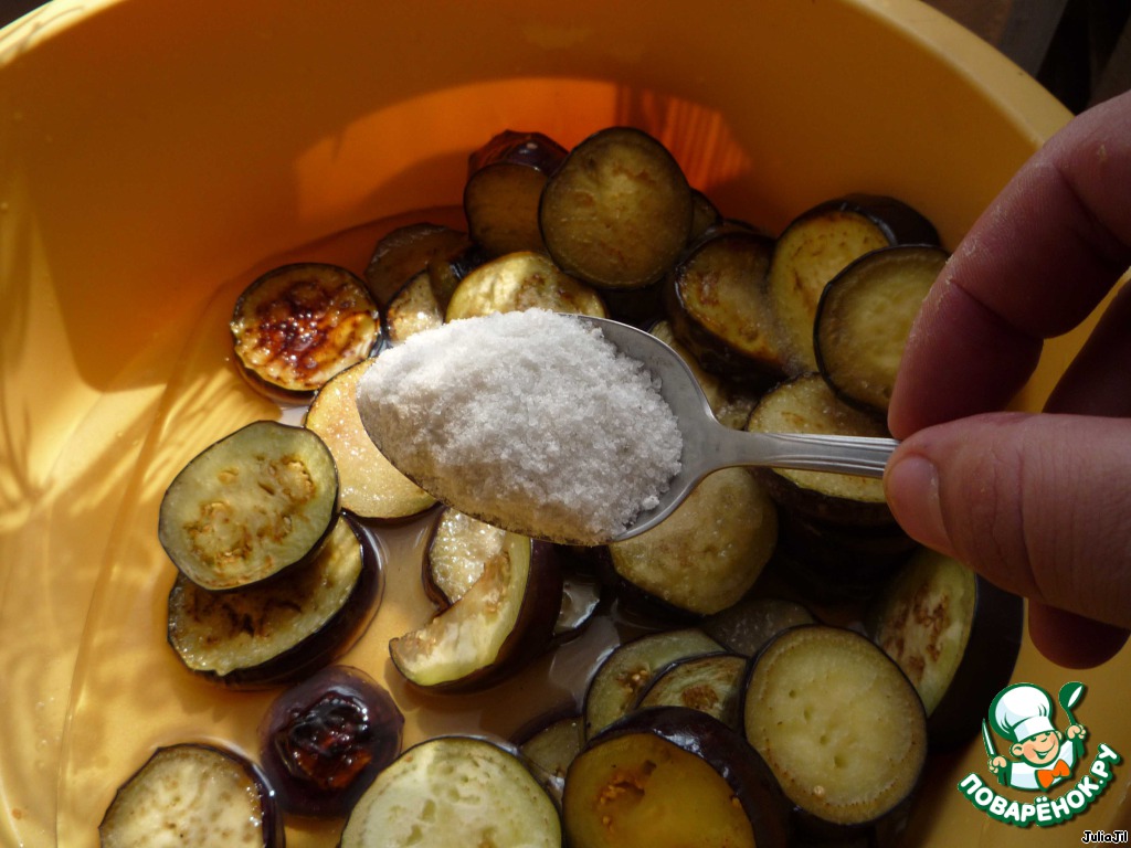 На среднем огне обжариваем баклажаны с обеих сторон и выкладываем в миску - там мы и будем перемешивать всю заготовку.