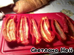 Натереть перцы получившимся соусом. Филе форели разрезать на 6 тонких кусочков и уложить в перцы-лодочки. Полить соусом.