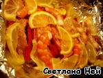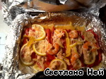 Разложить сверху лимон и креветки. Накрыть сверху фольгой и отправить в духовку на 30 минут.