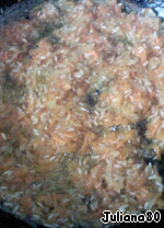 Добавляем рис (сырой) в зажарку из лука и моркови. На медленном огне обжариваем рис с овощами до полупрозрачности риса. Рис становится хрупким.