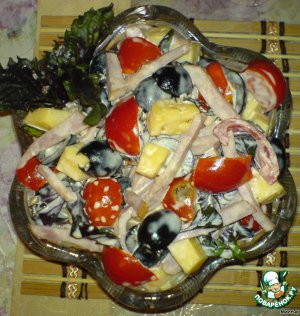 Этот салат для тех, кто очень любит сочетание: помидоры + базилик и маслины. Вкус очень оригинальный, а сам салат не нужно украшать, он очень красочный. Попробуйте, вам обязательно понравится!