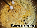 После чего добавляем подготовленную ваниль, цедру лимона и творог, предварительно слив с него сыворотку. Всё снова перемешиваем, но долго уже не взбиваем.