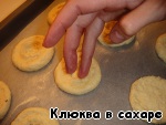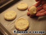 Включаем духовку на разогрев до 180 градусов. Выстилаем противень пекарской бумагой и немного смазываем её сливочным маслом. Достаём тесто из холодильника. Отделяем от него маленькие кусочки (около 15 г каждый), скатываем в шарик и, приплюснув его, делаем кружочки около 5 см. в диаметре.