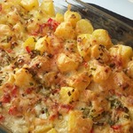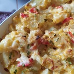 Как только картошка сварится, выкладываем ее в глубокий противень, сверху выливаем нашу заливочку, лук и перец болгарский и тщательно перемешиваем, чтобы вся картошка пропиталась заливочкой.