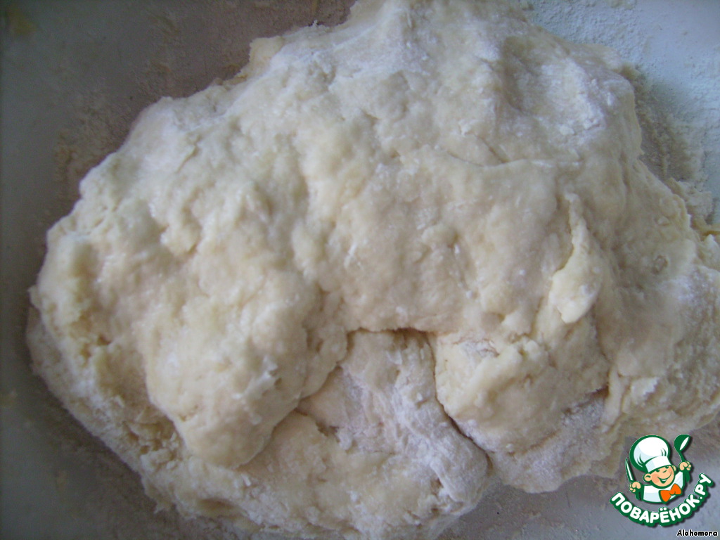 для теста мелко рубим маргарин или масло и перетираем с мукой. добавляем в смесь разрыхлитель и сметаны столько, чтобы замесить довольно крутое тесто.