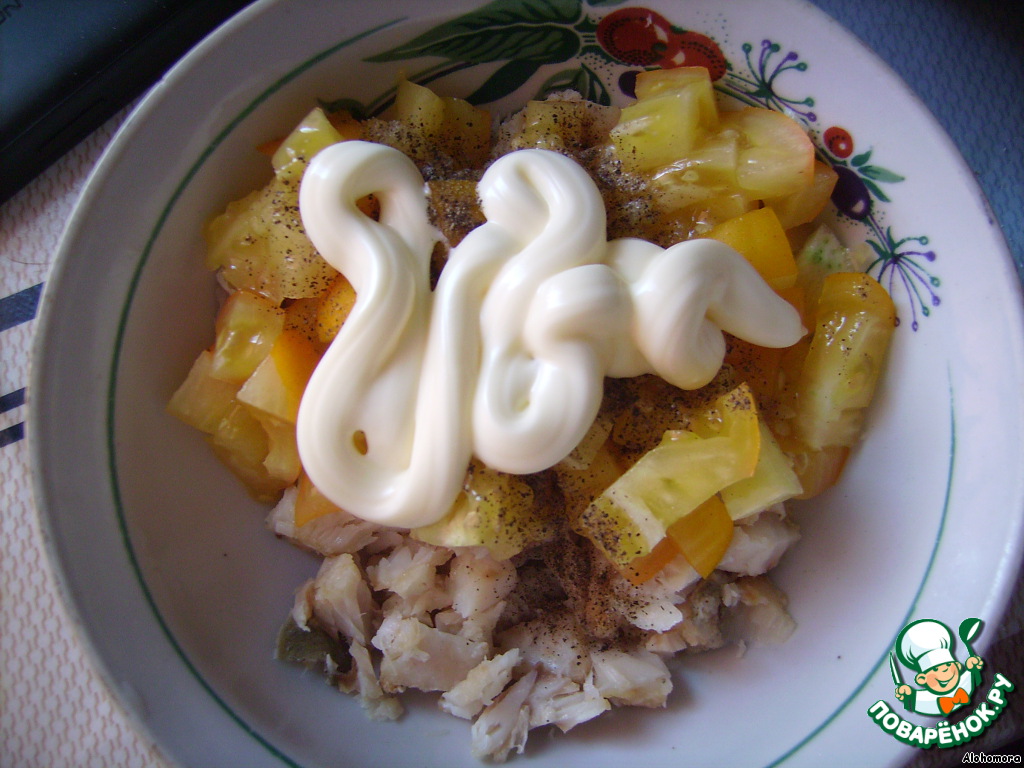добвавляем к рыбе с помидором перец, соль, немного майонеза и ложечку панировочных сухарей)