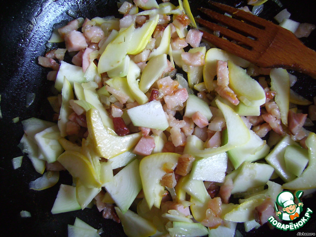 добавляем к слегка обжаренной грудинке с луком, солим, перчим и жарим до готовности) -