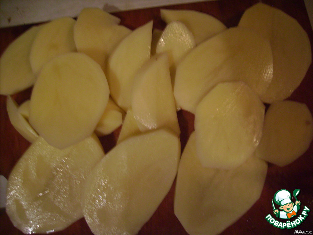 • картофель режем пластинками и слегка обжариваем на растительном масле. СЛЕГКА), чтобы был полусырой)))