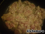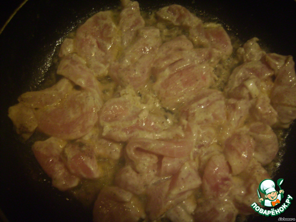 • курицу режем тонкими пластинками, солим, перчим, смешиваем со сметаной и лимонным соком.